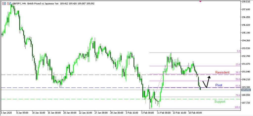 วิเคราะห์ GBPJPY กรอบเวลา H4 มีแนวโน้มดีดตัวขึ้น ราคากำลังทดสอบแนวรับที่ 189.33 ซึ่งเป็นแนว Pullback Support ใกล้ Fibonacci 61.8% หากดีดตัวขึ้น อาจพุ่งสู่แนวต้าน 190.69 แต่หากราคาหลุดแนวรับ อาจร่วงสู่ 188.11 ซึ่งเป็นแนวรับ Pullback ใกล้ Fibonacci 78.6%