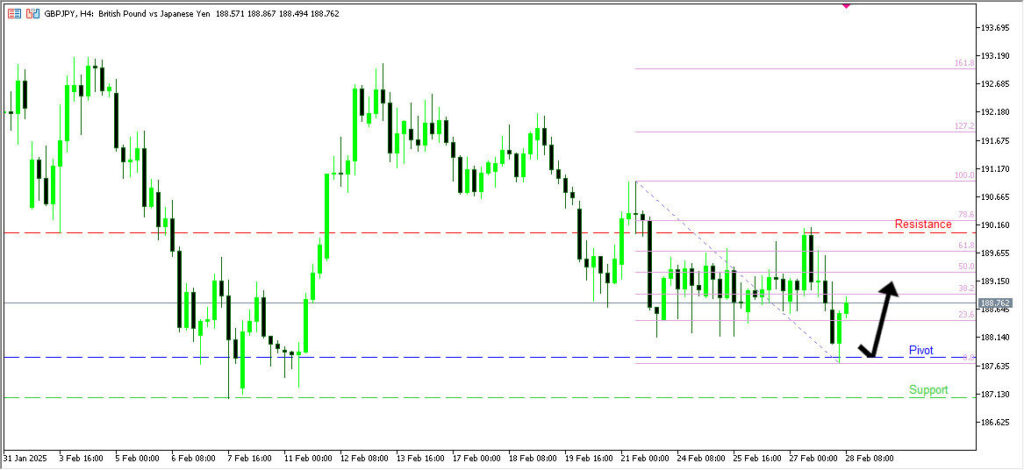 วิเคราะห์ GBPJPY กรอบเวลา H4 ราคาดีดตัวจากแนวรับสำคัญที่ 187.78 (Multi Swing Low Support) หากสามารถยืนเหนือระดับนี้ได้ มีโอกาสปรับตัวขึ้นไปทดสอบแนวต้านแรกที่ 190.02 (Overlap Resistance) แต่หากราคาหลุดแนว Pivot อาจปรับตัวลงไปหาแนวรับถัดไปที่ 187.07 (Swing Low Support)