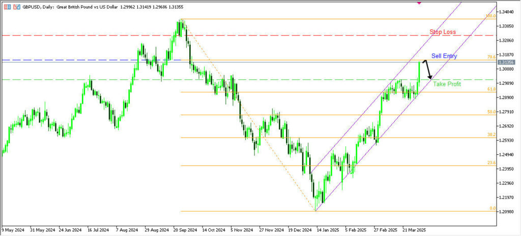 วิเคราะห์ GBPUSD จากกราฟรายวัน มีแนวโน้มกลับตัวเป็นขาลง หลังขึ้นแตะโซนแนวต้าน Fibonacci ที่ 1.3150 ซึ่งอาจกดดันให้ราคาลงต่อสู่แนวรับ 1.3013 แต่หากทะลุขึ้นได้ มีโอกาสขึ้นต่อถึง 1.3319