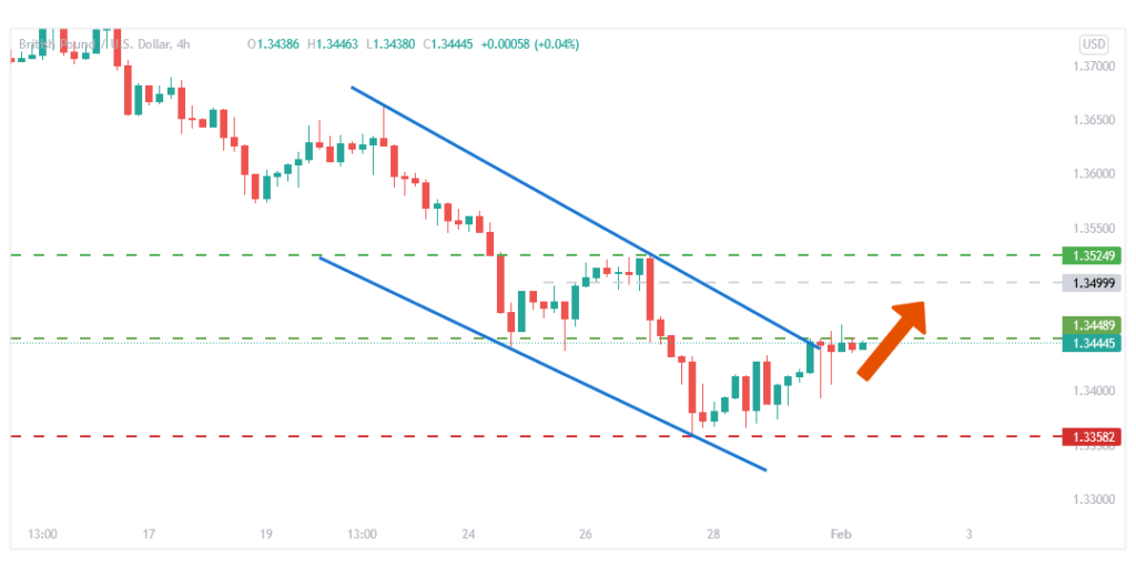 รูปแบบ Channel Down ถูกเบรกทะลุแนวต้านแล้ว ในระยะสั้นมีแนวโน้มที่ราคาจะขึ้นไปทดสอบที่บริเวณแนวต้านระดับ 1.3525