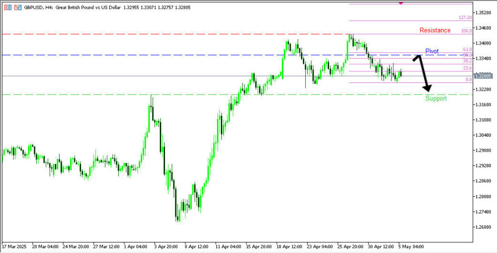 Tickmill Expert วิเคราะห์ GBPUSD กรอบเวลา H4 มีแนวโน้มกลับตัวลง โดยราคากำลังขึ้นทดสอบแนวต้านที่ 1.3362 ใกล้ Fibonacci 61.8% หากกลับตัวลง อาจร่วงสู่แนวรับที่ 1.3207 แต่หากทะลุขึ้นไปได้ มีโอกาสขึ้นต่อถึงแนวต้านถัดไปที่ 1.3444.