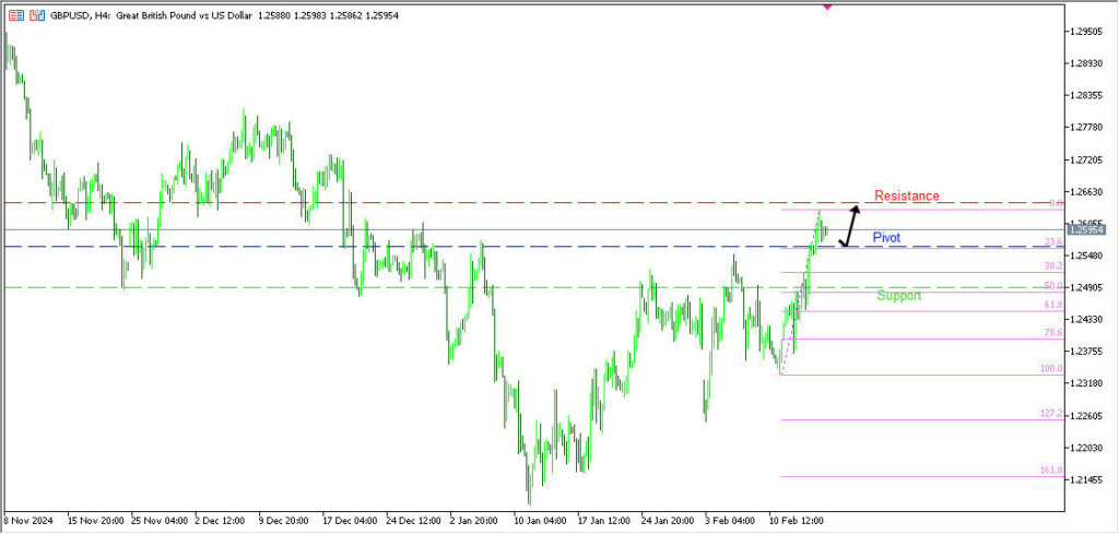 วิเคราะห์ GBPUSD กรอบเวลา H4 มีแนวโน้มดีดตัวขึ้นต่อเนื่อง ราคากำลังเข้าใกล้แนวรับ Pivot ที่ 1.2564 ซึ่งสอดคล้องกับ 23.6% Fibonacci Retracement หากกลับตัวขึ้น อาจพุ่งสู่แนวต้าน 1.2642 แต่หากหลุดแนว Pivot อาจร่วงลงสู่แนวรับ 1.2490 ใกล้ 50% Fibonacci Retracement