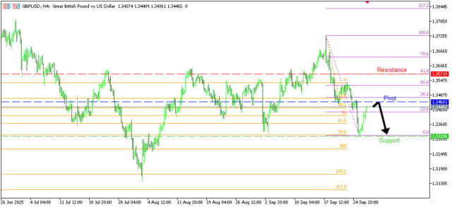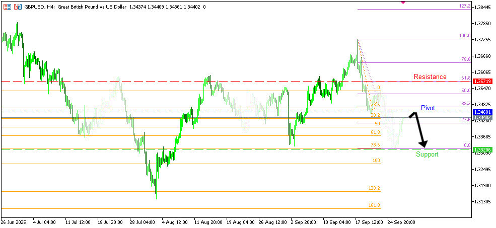 วิเคราะห์ GBPUSD บนกราฟ H4 กำลังขึ้นทดสอบโซน Pivot ที่ 1.3460 ซึ่งเป็นแนวต้านซ้อนทับใกล้ระดับ Fibonacci 38.2% หากราคากลับตัวลง มีโอกาสร่วงไปทดสอบแนวรับ 1.3320 ที่สอดคล้องกับ Fibonacci Projection 78.6% แต่หากทะลุ Pivot ขึ้นไปได้ อาจพุ่งต่อถึงแนวต้าน 1.3571 ที่ตรงกับ Fibonacci 61.8%