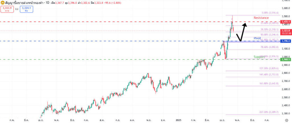 วิเคราะห์ ราคาทองคำรายวัน (Gold Futures) มีแนวโน้มย่อตัวลงทดสอบแนวรับที่ระดับ Fibonacci 61.8% แถว 3,196.60 หากยืนได้อาจดีดกลับขึ้นสู่แนวต้าน 3,435.10 แต่หากหลุดแนวรับนี้ ราคามีโอกาสร่วงต่อถึง 2,968.50.