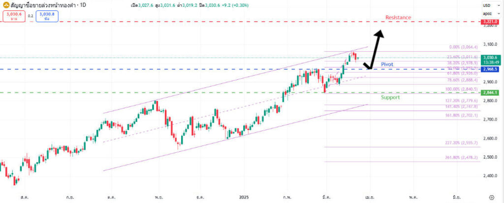 วิเคราะห์ Gold Futures(GC1!) บนกราฟ D1 มีแนวโน้มอ่อนตัวลงมาทดสอบแนวรับจากการย่อตัวที่บริเวณ 2,968.50 โดยหากยืนได้ มีโอกาสดีดกลับขึ้นไปทดสอบแนวต้านที่ 3,221.00 แต่หากหลุดแนว Pivot นี้ อาจร่วงต่อถึงแนวรับถัดไปที่ 2,844.10 ได้เช่นกัน