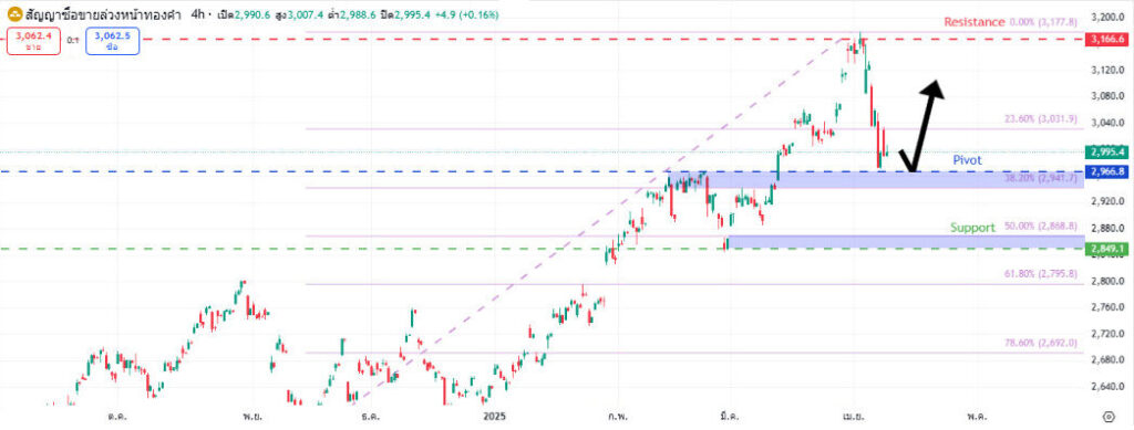 วิเคราะห์ Gold Futures บนกราฟ H4 ราคาทองคำมีแนวโน้มดีดตัวขึ้น จากแนวรับ ใกล้ 2,966.80 มุ่งหน้าแนวต้าน 3,166.60 แต่หากหลุดแนวรับนี้ อาจลงต่อถึง 2,849.10