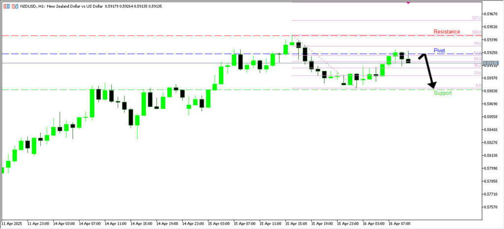 วิเคราะห์ NZDUSD กรอบเวลา H1 มีแนวโน้มกลับตัวลงจากแนวต้าน 0.5923 ซึ่งใกล้กับ Fibonacci 61.8% หากกลับตัวลง อาจร่วงสู่แนวรับ 0.5884 แต่หากทะลุขึ้นไปได้ อาจไปต่อถึงแนวต้าน 0.5943.