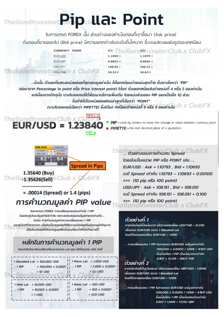 ในการซื้อขายแลกเปลี่ยน หรือเทรด Forex ส่วนต่างของค่าเงินที่เราซื้อมา (Ask price) กับตอนที่เราขายออกไป ( Bid Price)มีความแตกต่างในระดับที่เล็กมาก เทรดเดอร์จะเห็นค่าตัวเลขหรือการเปลี่ยนแปลงราคา แสดงผลในรูปของจุดทศนิยมจำนวนมาก ตั้งแต่ จุดทศนิยม 2 ถึง 5 ตำแหน่ง