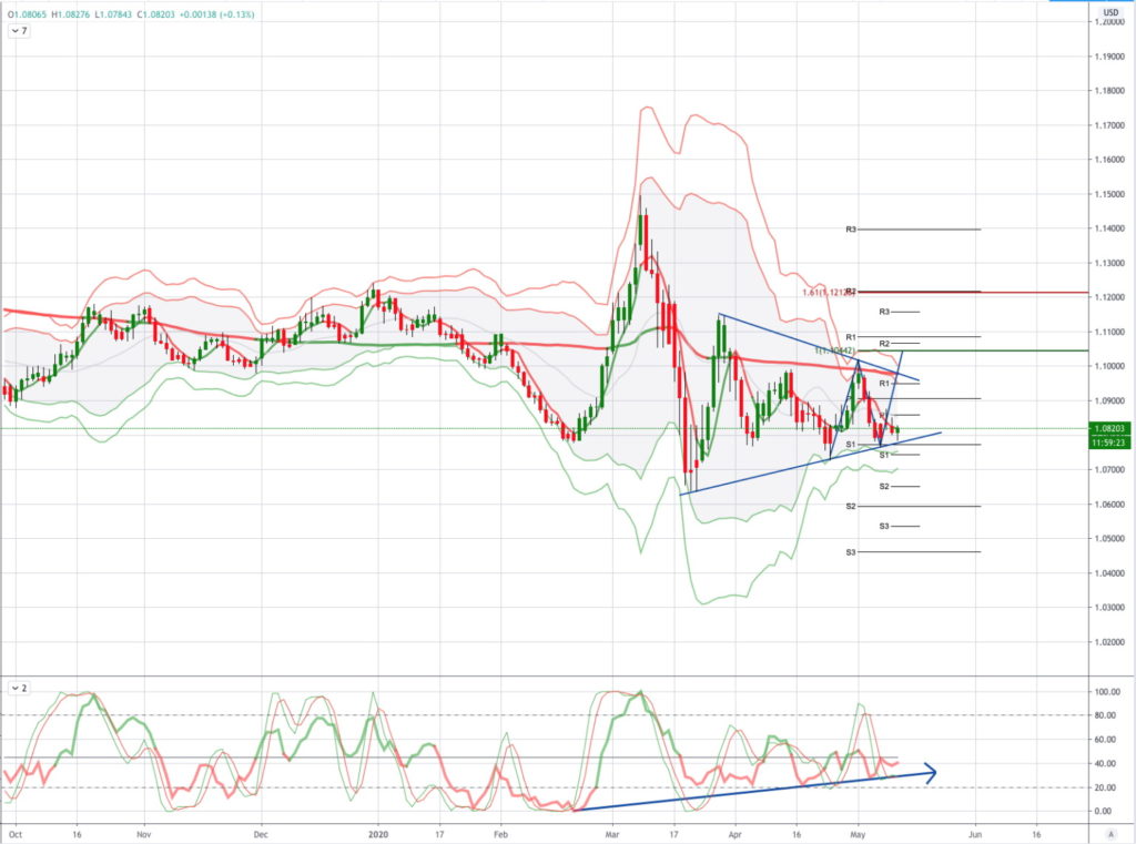 สำหรับกราฟ EUR/USD เกิดรูปแบบสามเหลี่ยมชี้ขึ้น (Ascending Triangle) ซึ่งอาจเป็นผลจากการเก็งกำไรสัญญาณซื้อขายล่วงหน้ามูลค่า 12,000 ล้านยูโรที่จะหมดอายุสัญญาในสัปดาห์นี้ โดยมีแนวรับ-แนวต้านอยู่ระหว่าง 1.0750-1.09 ทั้งนี้ บริเวณ 1.08 เป็นจุดเกิดสัญญาณเข้าซื้อ (bullish) ที่มีแนวโน้มแข็งค่าต่อไปในทิศทาง 1.09-1.0970 … อย่างไรก็ตาม ถ้าราคาไม่สามารถรักษาแนวรับ 1.0750 ไว้ได้ ก็มีโอกาสสูงที่จะกลับแนวโน้มอ่อนค่าลงไปยังบริเวณ 1.0630 ซึ่งเป็นจุดราคาต่ำสุดของรอบปี