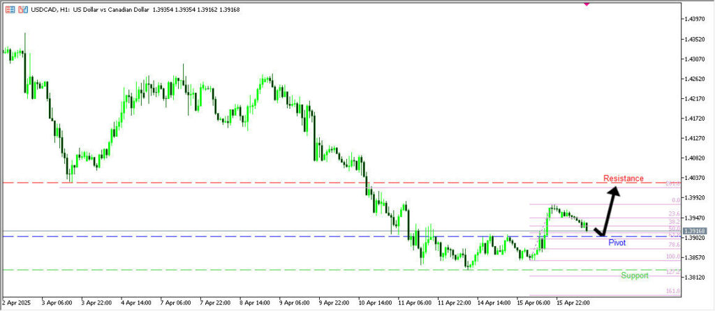 วิเคราะห์ USDCAD กรอบเวลา H1 มีแนวโน้มดีดกลับขึ้นจากแนวรับ 1.3904 ซึ่งใกล้กับ Fibonacci 50% หากยืนได้อาจพุ่งสู่แนวต้าน 1.4025 แต่หากหลุดต่ำกว่านี้อาจร่วงต่อถึงแนวรับ 1.3829.