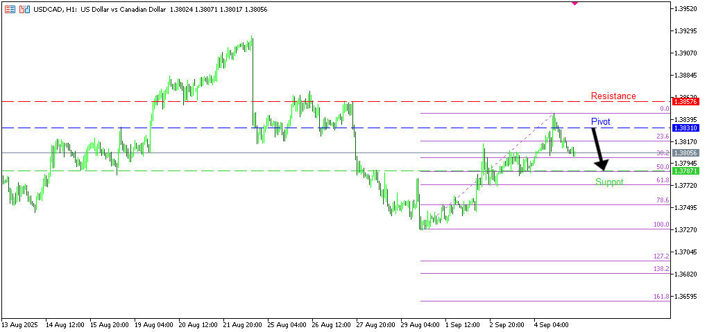 วิเคราะห์ USDCAD บนกราฟ H1 ราคากำลังตอบสนองต่อ Pivot ที่ 1.3831 ซึ่งเป็นแนวต้าน Pullback การกลับตัวจากระดับนี้ อาจกดให้ราคาลงไปยังแนวรับแรกที่ 1.3787 ซึ่งซ้อนกับ 50% Fibonacci Retracement