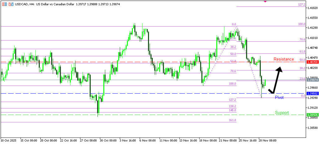 วิเคราะห์ USDCAD บนกราฟ H4 มีแนวโน้มกลับตัวขึ้นหลังราคาเด้งจากโซน Pivot 1.3950 ซึ่งเป็นแนวรับซ้อนทับ หากรีบาวด์ต่ออาจขึ้นไปทดสอบแนวต้านแรก 1.4035 ใกล้ระดับ Fibonacci 50% แต่ถ้าหลุดโซน Pivot อาจเห็นการอ่อนตัวลงสู่แนวรับ 1.3892 ที่ทับซ้อนกับ Fibonacci Extension 145%