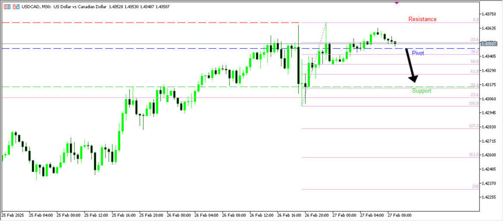 วิเคราะห์ USDCAD กรอบเวลา M30 มีแนวโน้มขาลง ราคากำลังเข้าใกล้แนว Pivot ที่ 1.4349 ซึ่งเป็นแนวต้านสำคัญ หากทะลุลง อาจร่วงสู่แนวรับที่ 1.4315 แต่หากกลับตัวขึ้น อาจพุ่งไปแนวต้านที่ 1.4368