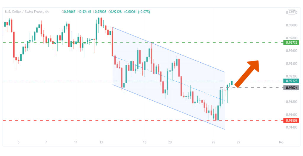 USDCHF คู่นี้เป็น pattern แบบ Channel Down โดยรูปแบบราคาจาก Time frame 4 ชั่วโมง