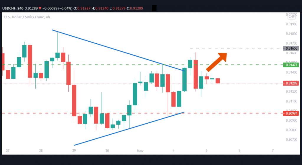 USDCHF คู่นี้เป็น pattern แบบ Triangle โดยรูปแบบราคาจาก Time frame 4 ชั่วโมง