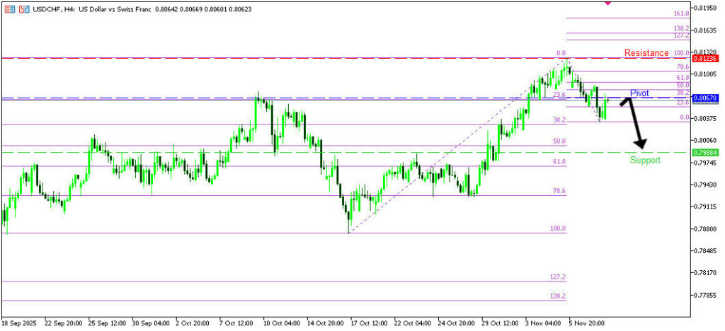 วิเคราะห์คู่เงิน USDCHF บนกราฟ H4 มีแนวโน้ม อ่อนตัวลงต่อ หลังราคาปรับขึ้นทดสอบโซน Pivot ที่ 0.8067 ซึ่งเป็นแนวต้านจากการดีดกลับและสอดคล้องกับระดับ Fibonacci 38.2% หากเกิดการกลับตัวลงจากบริเวณนี้ มีโอกาสที่ราคาจะร่วงสู่แนวรับแรกที่ 0.7988 ซึ่งเป็นแนวรับซ้อนและอยู่ต่ำกว่า Fibonacci 50% เล็กน้อย
