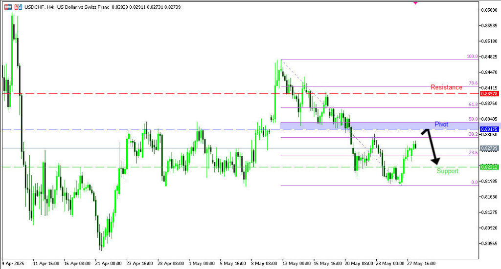 วิเคราะห์ USDCHF กรอบเวลา H4 ราคากำลังขึ้นใกล้ระดับ pivot 0.831 (Fibo 50%) อาจกลับตัวลงสู่แนวรับแรก 0.8231 แต่ถ้าทะลุ pivot ขึ้นไป อาจไปต่อที่แนวต้าน 0.8397