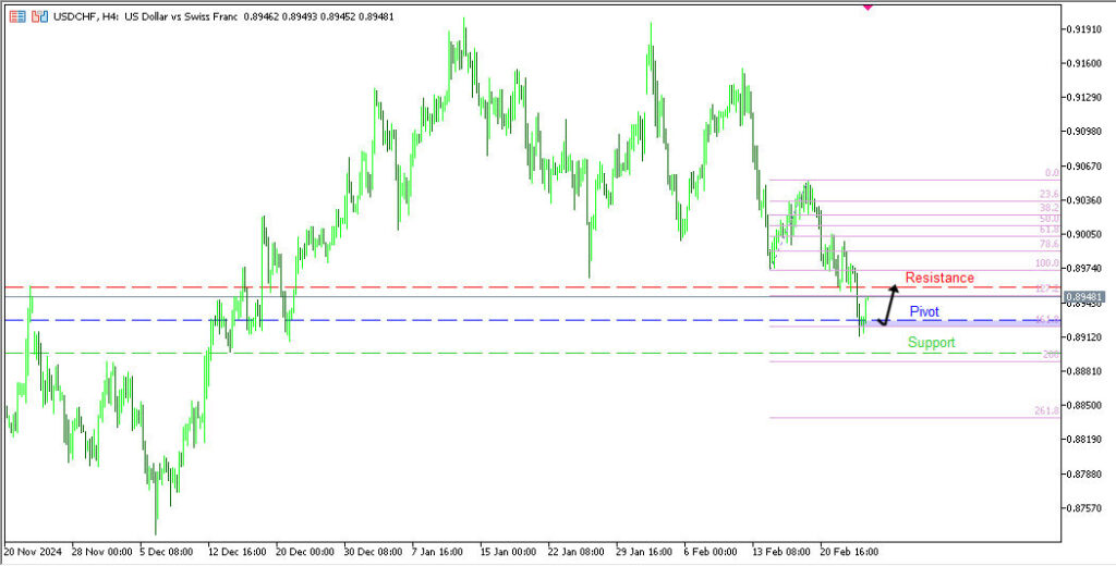 วิเคราะห์ USDCHF รอบเวลา H4 ราคากำลังทดสอบแนว Pivot ที่ 0.8920 ซึ่งเป็นแนวรับสำคัญที่สอดคล้องกับ Fibonacci Extension 161.8% และ Fibonacci Projection 78.6% หากราคาดีดตัวขึ้น อาจไปถึงแนวต้านที่ 0.8956 แต่หากหลุดแนว Pivot อาจร่วงสู่แนวรับถัดไปที่ 0.889