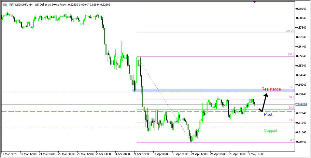 USDCHF กรอบเวลา H4 มีแนวโน้มดีดตัวขึ้นจากแนวรับที่ 0.8233 หากยืนได้อาจขึ้นต่อถึงแนวต้านที่ 0.8358 ซึ่งใกล้ระดับ Fibonacci 61.8% แต่หากหลุดแนวรับนี้ มีโอกาสร่วงต่อถึงแนวรับถัดไปที่ 0.8131.