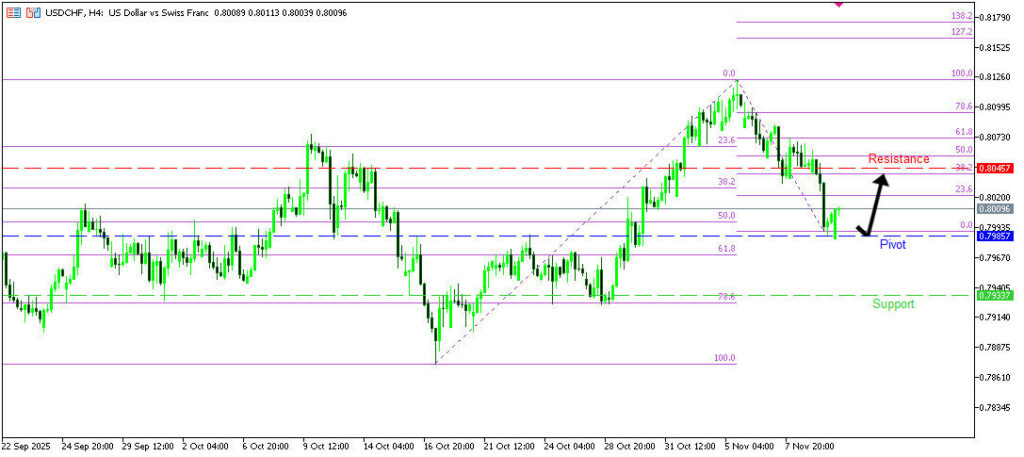 วิเคราะห์คู่เงิน USDCHF บนกราฟ H4 มีแนวโน้มรีบาวด์จากแนวรับสำคัญที่ 0.7985 หากราคาดีดตัวขึ้น อาจขึ้นทดสอบแนวต้านที่ 0.8045 ใกล้ระดับ Fibonacci 38.2% แต่หากหลุดแนวรับดังกล่าว อาจอ่อนตัวต่อสู่โซน 0.7933 ซึ่งสอดคล้องกับระดับ Fibonacci 78.6%