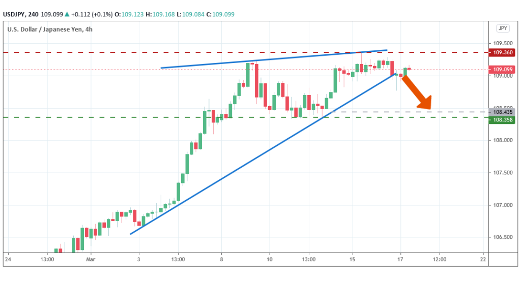 USDJPY คู่นี้เป็น pattern แบบ Rising Wedge โดยรูปแบบราคาจาก Time frame 4 ชั่วโมง รูปแบบ Rising Wedge ถูกเบรกแล้ว ในระยะสั้นมีแนวโน้มที่ราคาจะลดลงไปทดสอบที่บริเวณแนวรับช่วง 108.4350 – 108.3580