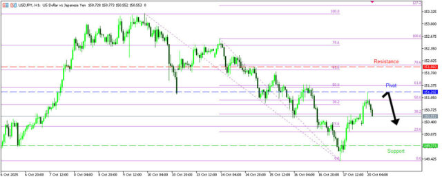 วิเคราะห์ USDJPY บนกราฟ H1 มีแนวโน้มกลับตัวลงจากแนวต้านหลัก ราคากำลังปรับขึ้นเข้าใกล้โซน 151.20 ซึ่งเป็นแนวต้าน Overlap ใกล้ระดับ Fibonacci 50% และ 61.8% หากราคากลับตัวจากบริเวณนี้ มีโอกาสปรับลงต่อสู่แนวรับที่ 149.77 แต่หากราคาทะลุเหนือ 151.20 ขึ้นไป อาจขยับขึ้นทดสอบแนวต้านถัดไปบริเวณ 151.86