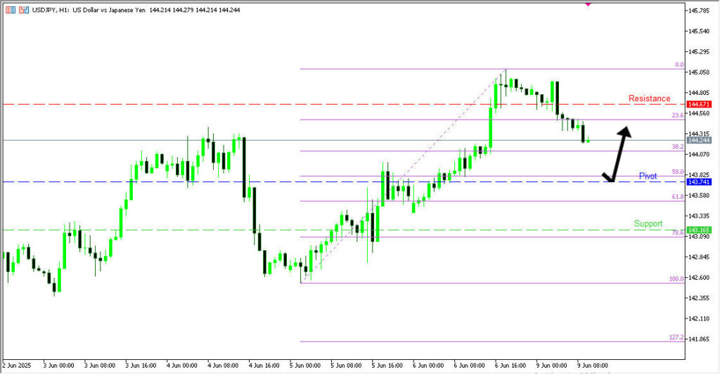 ราคากำลังย่อตัวลงใกล้โซนแนวรับสำคัญที่ 143.74 ซึ่งตรงกับ Fibo 50% — ถ้ารับอยู่และมีแรงซื้อกลับ อาจเห็นการดีดตัวขึ้นไปทดสอบแนวต้านแรกที่ 144.67