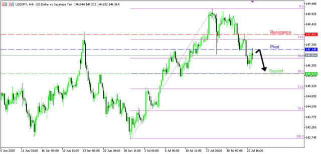 USDJPY กราฟ H4 มีแนวโน้มกลับตัวลง หลังราคาเพิ่งดีดตัวจากแนวต้านที่ 147.14 ซึ่งเป็นแนวต้านระหว่างทาง หากย่อตัวลงต่อ มีโอกาสลงสู่แนวรับแรกที่ 145.92 ซึ่งเป็นแนวรับซ้อนทับและตรงกับ Fibonacci 50% แต่หากราคาทะลุขึ้นเหนือ 147.14 อาจไปต่อถึงแนวต้านถัดไปที่ 147.90