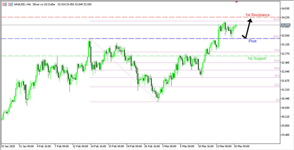 วิเคราะห์ XAGUSD กรอบเวลา H4 ราคากำลังเข้าใกล้ Pivot 33.37 ซึ่งเป็นแนวรับจากการดึงกลับ หากสามารถดีดตัวขึ้นได้ มีโอกาสปรับตัวไปที่ แนวต้าน 34.24 ซึ่งสอดคล้องกับ 127.2% Fibonacci Extension แต่หากราคาหลุดแนวรับนี้ อาจปรับตัวลงไปที่ แนวรับ 32.67 ซึ่งเป็นแนวรับซ้อนทับ