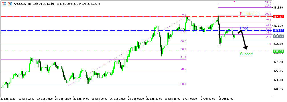 XAUUSD H1 | กำลังเข้าใกล้แนวต้าน Fibo 50% By Webmaster - October 3, 2025 51 0 Facebook Twitter Pinterest WhatsApp Email LINE วิเคราะห์ XAUUSD บนกราฟ H1 ราคาทองกำลังขึ้นทดสอบโซน Pivot ที่ 3,859.03 ซึ่งเป็นแนวต้านระหว่างทางและตรงกับระดับ Fibo 50% หากกลับตัวลง มีโอกาสร่วงสู่แนวรับแรกที่ 3,806.19 แต่ถ้าทะลุขึ้นไปได้ อาจไปต่อถึง 3,894.97 แนวต้านจุดสูงซ้ำหลายครั้ง