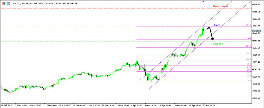วิเคราะห์ XAUUSD กรอบเวลา H4 มีแนวโน้มกลับตัวลงระยะสั้น โดยราคากำลังขึ้นทดสอบ Pivot ที่ 3502.73 (ตรงกับ Fibonacci Extension 261.8%) หากกลับตัวลง อาจร่วงสู่แนวรับแรกที่ 3381.31 แต่ถ้าทะลุขึ้นเหนือ Pivot อาจพุ่งต่อสู่แนวต้านที่ 3687.82 (ตรงกับ Fibonacci Projection 127.2%)