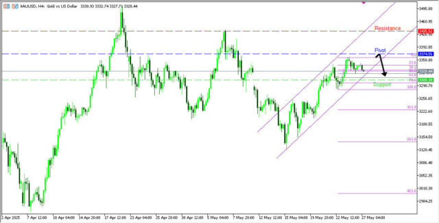 XAUUSD กรอบเวลา H4 มีโอกาสกลับตัวลงในระยะสั้น โดยราคากำลังเคลื่อนตัวขึ้นสู่แนวต้านสำคัญที่ 3374.56 ซึ่งเป็น pullback resistance หากกลับตัวลงอาจลงไปหาแนวรับแรกที่ 3305.38 ใกล้กับ Fibonacci retracement 61.8% แต่หากราคาทะลุขึ้นไปได้ อาจพุ่งต่อไปยังแนวต้านแรกที่ 3435.52.