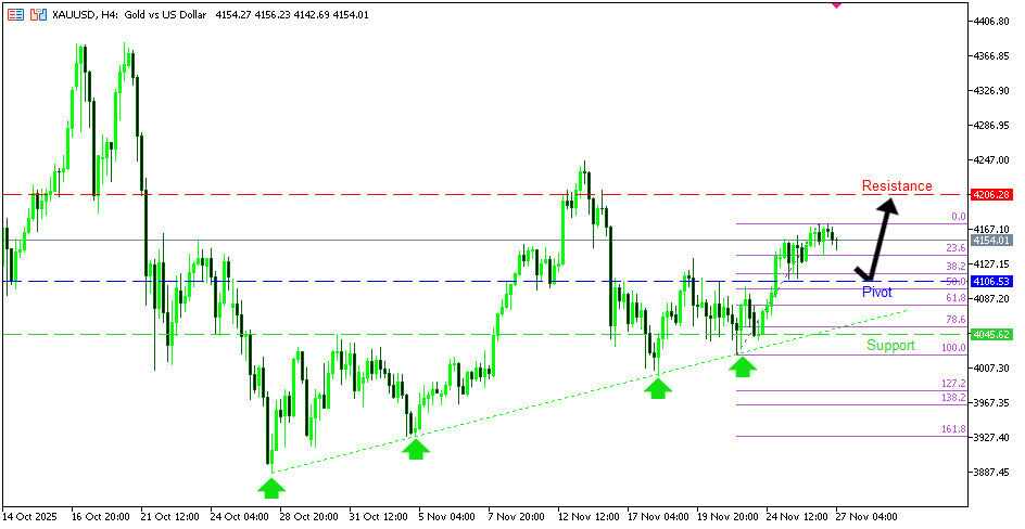 XAUUSD H4 | การรีบาวด์ขึ้นอาจเกิดจากโซน 50% Fibonacci By Webmaster - November 27, 2025 3 0 Facebook Twitter Pinterest WhatsApp Email LINE วิเคราะห์ XAUUSD บนกราฟ H4 มีแนวโน้มรีบาวด์ขึ้นจากโซน 4,106.53 ซึ่งเป็นแนวรับทับซ้อนร่วมกับระดับ Fibonacci 50% หากดีดขึ้นได้ มีโอกาสขึ้นทดสอบแนวต้านถัดไปที่ 4,206.28 แต่หากราคาหลุดลงใต้โซนนี้ อาจอ่อนตัวต่อสู่แนวรับถัดไปบริเวณ 4,045.62