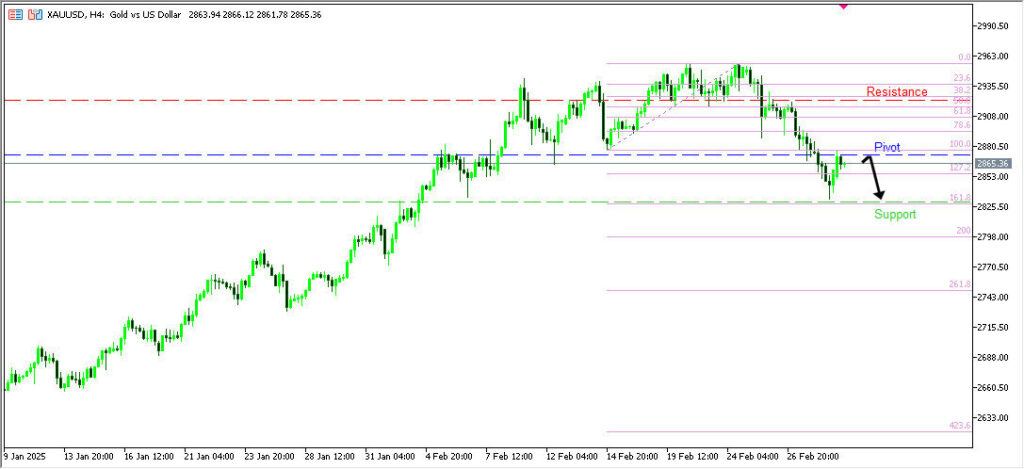 วิเคราะห์ XAUUSD กรอบเวลา H4 ราคากำลังทดสอบแนว Pivot 2882.96 ซึ่งเป็นแนวต้าน Pullback หากปรับตัวลง อาจร่วงสู่แนวรับแรก 2829.34 ซึ่งสอดคล้องกับ Fibonacci 161.8%