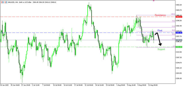 XAUUSD H4 | มีโอกาสปรับตัวลง By Webmaster - August 14, 2025 152 0 Facebook Twitter Pinterest WhatsApp Email LINE วิเคราะห์ XAUUSD บนกราฟ H4 มีแนวโน้มปรับตัวลง โดยราคากำลังทดสอบแนวต้าน Pivot ที่ 3,366.42 ซึ่งอยู่ต่ำกว่าระดับ Fibonacci 50% เล็กน้อย หากถูกปฏิเสธอาจร่วงสู่แนวรับ 3,332.08 แต่หากทะลุขึ้นไปได้มีโอกาสขึ้นทดสอบแนวต้าน 3,404.53