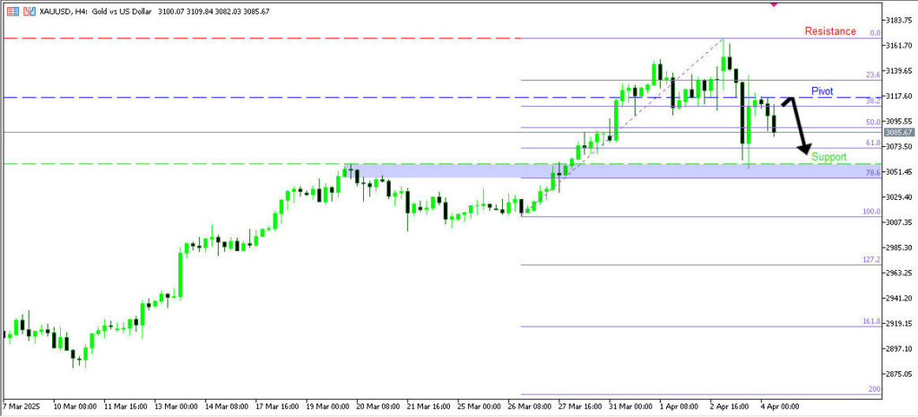 วิเคราะห์ XAUUSD บนกราฟ H4 มีแนวโน้มกลับตัวลงหลังดีดตัวจากแนวต้าน Pivot ที่ 3116.33 โดยมีโอกาสร่วงต่อสู่แนวรับแรกที่ 3058.02 แต่หากราคาทะลุขึ้นเหนือ Pivot ได้ อาจพุ่งต่อไปหาแนวต้านที่ 3167.82