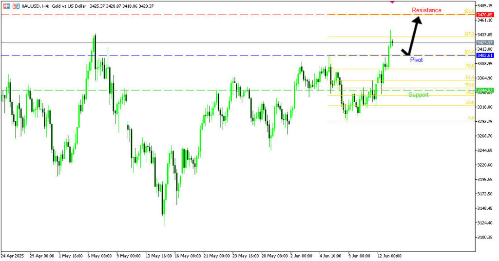 วิเคราะห์ XAUUSD กรอบเวลา H4 ราคากำลังอ่อนตัวลงใกล้แนวรับ Pivot ที่ 3402.61 ซึ่งหากยืนได้ อาจเกิดการดีดกลับขึ้นทดสอบแนวต้านที่ 3470.05 ซึ่งตรงกับ Fibonacci Extension 161.8% แต่หากหลุดลงไป มีโอกาสร่วงต่อสู่แนวรับถัดไปที่ 3344.57.